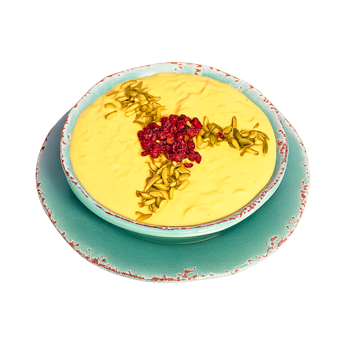 Sweet saffron yogurt with shredded chicken.